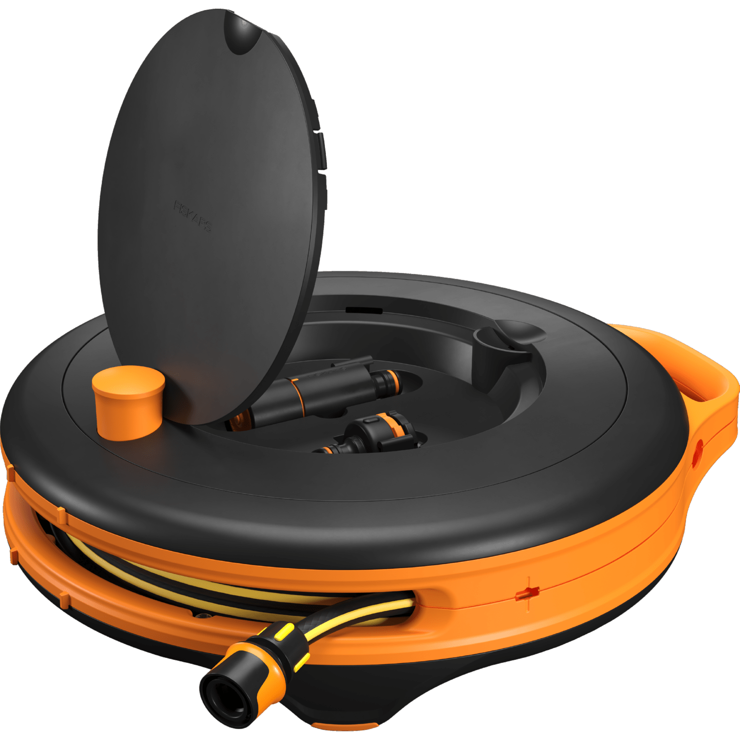 Súprava ponúka celkový dosah 15 metrov a je osadená odolnou hadicou s priemerom 9 mm (3/8”). Produkt je navrhnutý ako riešenie „všetko v jednom“ a je ihneď pripravený na použitie. Obsahuje integrovanú praktickú schránku s príslušenstvom, kde je uložená multi spojka ku kohútiku a zavlažovacia tryska. Okrem voľného umiestnenia na trávniku je tento bubon možné pripevniť aj na stenu pomocou voliteľného držiaka (obj. č. 1020448).