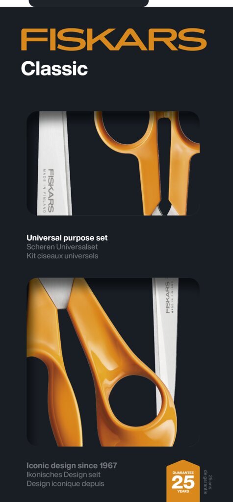 Ideális univerzális ollószett Finnországból a mindennapi szükségletekhez. A szett tartalmaz egy nagy univerzális ollót 21 cm hosszúsággal (modell 1075031) és annak kisebb változatát 16 cm hosszúsággal (modell 1075053), így a nehezebb vágási feladatokat és a finom, precíz munkát is elvégezheti.
