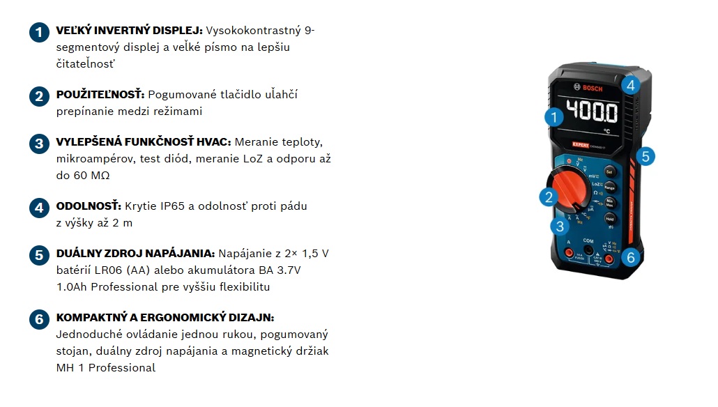 Az EXPERT digitális multiméter kompatibilis a BA 3.7V 1.0Ah professzionális akkumulátorral; MH 1 Professional, MS 90 Professional és K típusú hőmérséklet-érzékelővel.