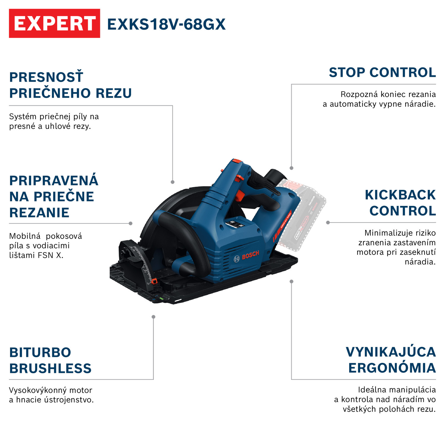 AZ EXPERT EXKS18V-68 GX egy csúcsminőségű 18 V-os körfűrész, amely pontos keresztvágást biztosít. A FSN X vezetősínekkel kombinálva kiváló mobil vágórendszert alkot a precíz és szögletes vágásokhoz. Erőteljes BITURBO Brushless technológiával, nagy teljesítményű motorral és hajtóművel van felszerelve, amelyek kifejezetten az EXPERT akkumulátorok extrém teljesítményének kihasználására lettek tervezve. Az EXPERT EXKS18V-68 GX készen áll a keresztvágásra, és a Bosch FSN X vezetősínekkel kombinálva a szerszám csúcsminőségű mobil vágó- és ferde fűrésszé alakul. Ez a körfűrész fejlett védelemmel van ellátva: a Stop Control funkció észleli a vágás végét, és azonnal leállítja a szerszámot, míg a KickBack Control funkció megállítja a motort, ha a szerszám megakad. Mindkét funkció minimalizálja a sérülés kockázatát. A szerszám kiváló ergonómiája lehetővé teszi a tökéletes kezelhetőséget és irányítást minden vágási helyzetben.