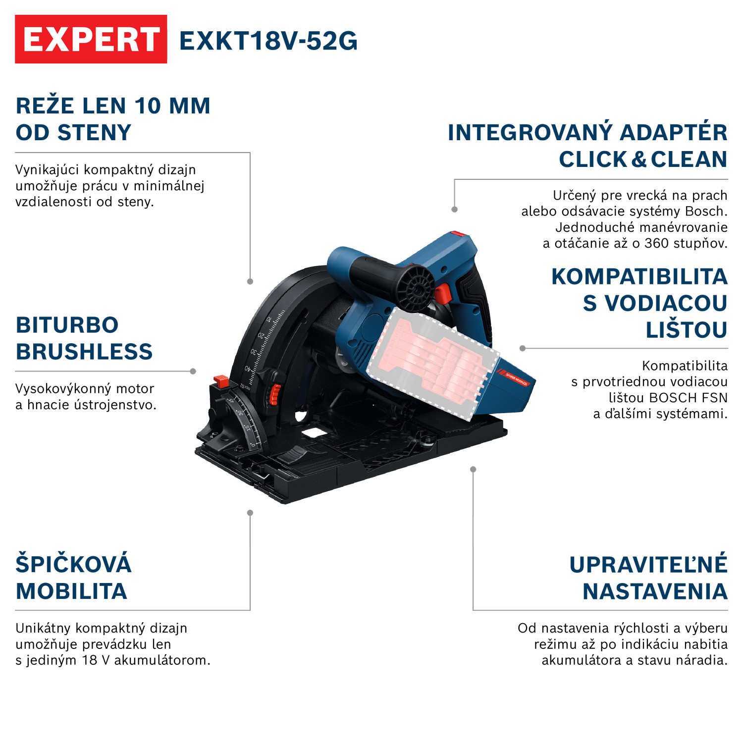 A EXPERT EXKT18V-52G körfűrész rendkívül kompakt kialakítással rendelkezik, amely lehetővé teszi a falhoz való minimális távolságból való munkavégzést, és csak 10 mm-re a faltól való vágást. A BITURBO Brushless technológia, a nagy teljesítményű motor és a hajtómű úgy van tervezve, hogy az EXPERT akkumulátorokkal kombinálva kiváló teljesítményt nyújtson. Ez a kompakt körfűrész egyetlen 18 V akkumulátorral kiváló mobilitást biztosít. Az integrált Click&Clean adapter a Bosch porelszívó megoldásokhoz lett tervezve. Könnyű manőverezés, 360 fokos forgatás. Az EXPERT EXKT18V-52G kompatibilis a kiváló BOSCH FSN vezetősínünkkel és más általános rendszerekkel. A felhasználóbarát HMI interfész állítható beállításokkal rendelkezik: sebességbeállítás, üzemmód választás (pl. ECO üzemmód az akkumulátor egyetlen töltéssel való hosszabb üzemidejéhez), valamint az akkumulátor töltöttségi állapotának és a készülék állapotának jelzése – például túlterhelés elleni védelem.