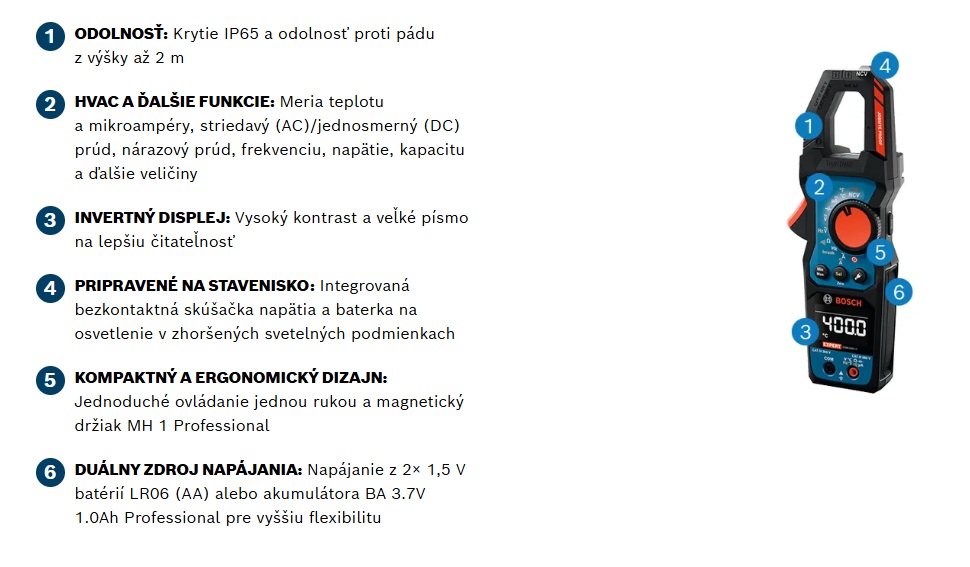 AZ EXPERT fogó ampermérő váltakozó és egyenáramot mér akár 600 A-ig és feszültséget 600 V AC/DC-ig. Kompatibilis a BA 3.7V 1.0Ah A Professional lítium-ion akkumulátorral; MH 1 Professional mágneses tartóval, MS 90 Professional tesztkábelekkel és K típusú Professional hőmérséklet-érzékelővel.