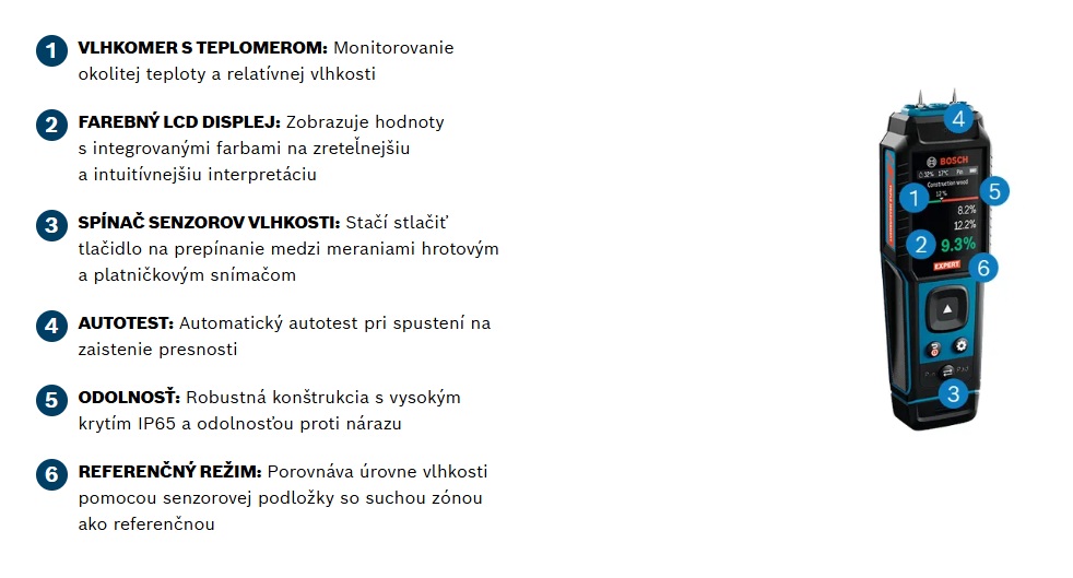 AZ EXPERT EXMM3-17 egy tartós, ütésálló nedvességmérő, gumírozott házzal és IP65 védettséggel. 37 fafajta és 10 építőanyag nedvességtartalmát méri. Van egy gomb a nem invazív lemezes érzékelő és az invazív szondás érzékelő közötti váltáshoz. A lemezes érzékelő lehetővé teszi nagyobb felületek gyors beolvasását száraz zónaként, mint összehasonlító referencia.