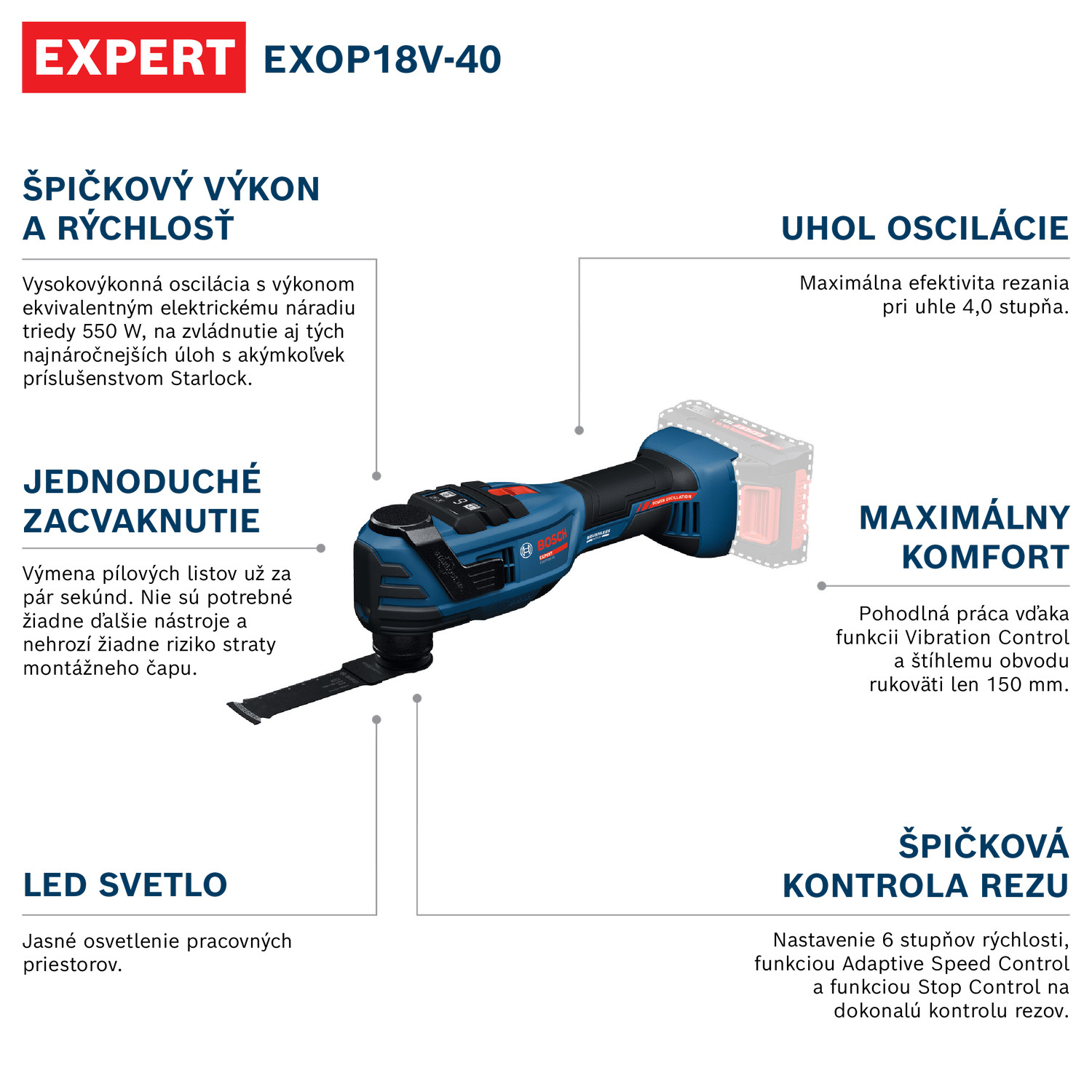 AZ EXPERT EXOP18V-40 egy 18 V-os oszcilláló multifunkciós szerszám, amely kiváló teljesítménnyel rendelkezik, és a legnehezebb feladatok elvégzésére lett tervezve bármilyen kompatibilis Starlock tartozékkal – beleértve a StarlockMax-ot is. A nagy teljesítményű, kefementes motor magas teljesítményű oszcillációt biztosít, amelynek teljesítménye egyenértékű az 550 W-os elektromos szerszámokkal. Az oszcillációs szög 4,0° a maximális vágási hatékonyság érdekében. Az egyszerű rögzítési mechanizmus lehetővé teszi a gyors, szerszám nélküli fűrészlapcserét, és nincs kockázat a rögzítőcsap elvesztésére. A Vibration Control funkció hatékonyan csökkenti a káros rezgéseket, és a mindössze 150 mm kerületű karcsú fogantyú maximális munkakényelmet biztosít.