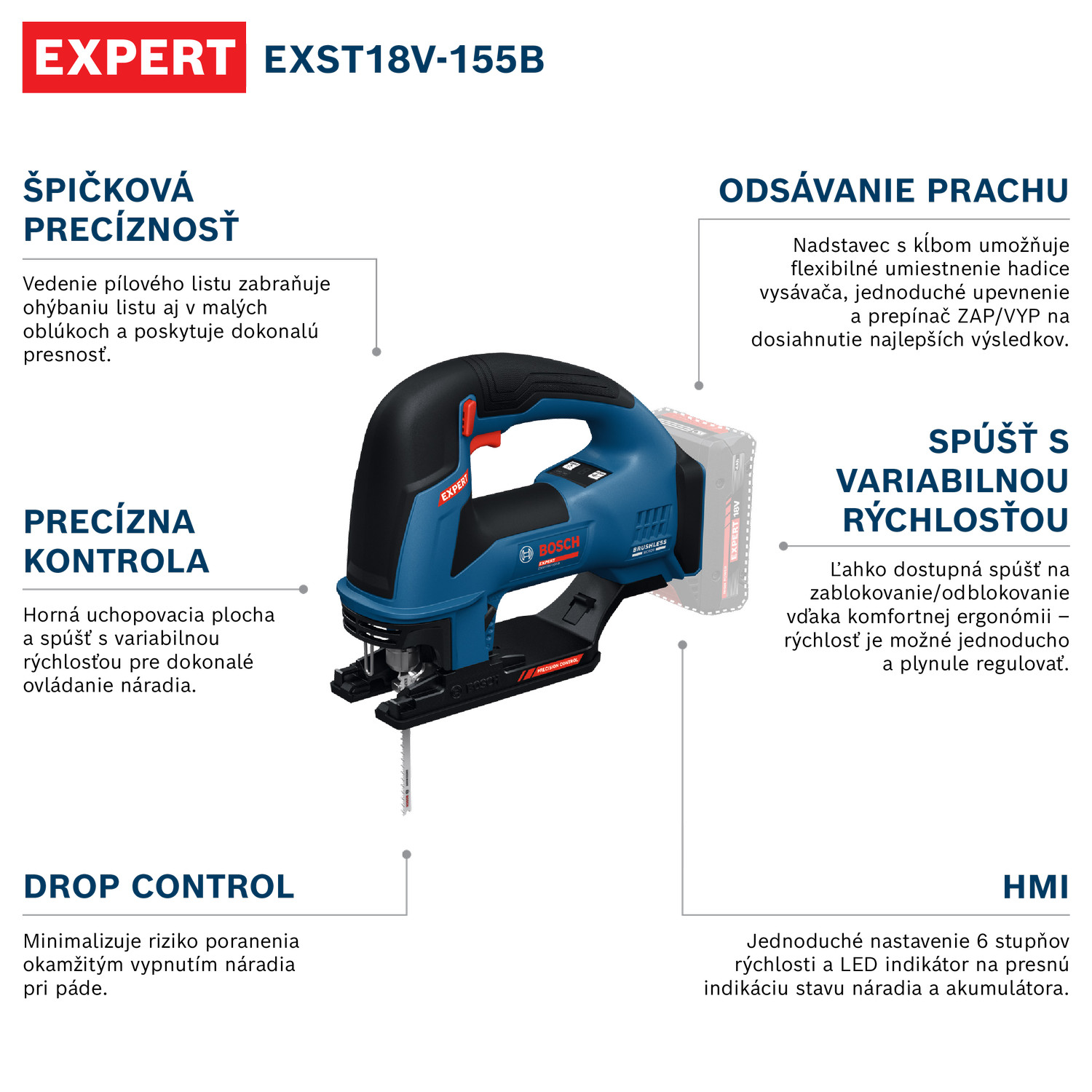 18 V egyenesvágó fűrész EXPERT EXST18V-155B hengertartóval kiváló precizitást biztosít. A fűrészlap vezetője megakadályozza a fűrészlap meghajlását még kis ívekben is, és tökéletes precizitást nyújt. Az intuitív ergonomikus dizájn a felső fogási felülettel és a változó sebességű indítóval lehetővé teszi a szerszám tökéletes irányítását, és biztosítja a vágás kiváló precizitását. Az egyenesvágó fűrész fejlett felhasználóvédelmi funkcióval rendelkezik: a Drop Control funkció minimalizálja a sérülés kockázatát azáltal, hogy esés esetén a szerszám azonnal leáll. Megbízható porelszívást biztosít könnyen rögzíthető, flexibilis csőelhelyezésre alkalmas adapterekkel, valamint praktikus ON/OFF kapcsolóval a legjobb munkateljesítmény érdekében. A kényelmes ergonómia révén a változó sebességű indító a rögzítéshez és a feloldáshoz az ujjak elérhetőségén belül van, és kényelmes, folyamatos sebességbeállítást is lehetővé tesz. A szerszám HMI felhasználói felülete lehetővé teszi a 6 sebességfokozat egyszerű beállítását, az LED jelző pedig pontosan mutatja a szerszám és az akkumulátor állapotát.
