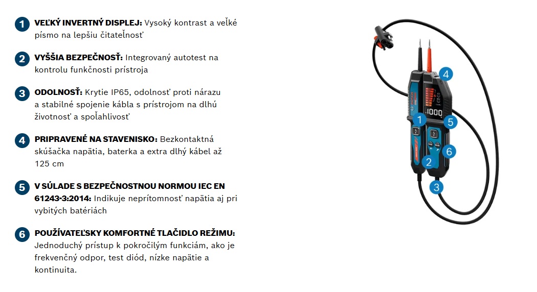 Tento prístroj EXPERT odskúša napätie až do 1000 V (AC/DC) a je vybavený LED a LCD displejom na presné odčítanie údajov, aj zvukovým a vibračným upozornením.