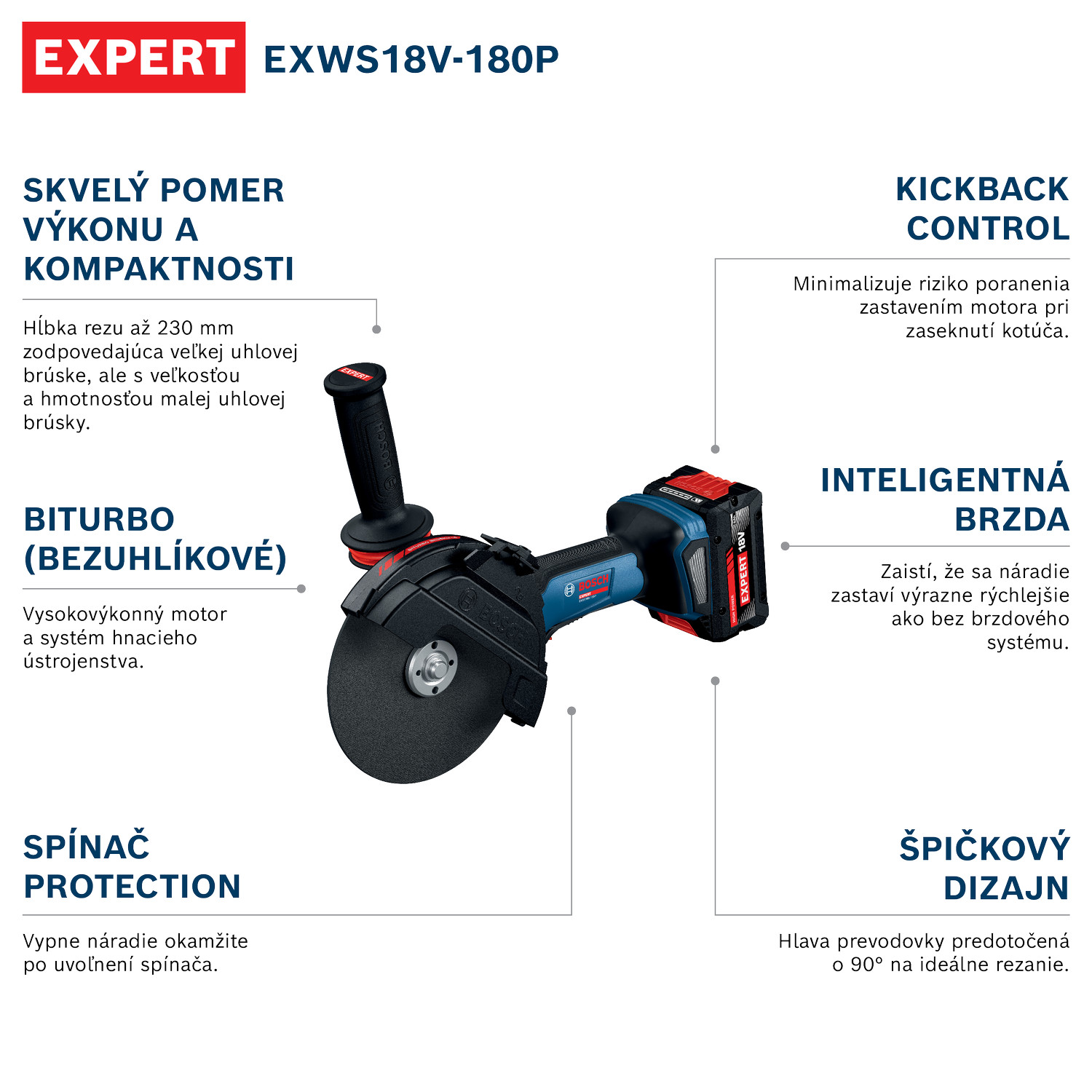 A csúcsminőségű EXPERT EXWS18V-180P sarokcsiszoló tökéletes arányt biztosít a kompakt méret, a vágási mélység és a védelem között. Extrém vágási mélységet kínál, mint egy 230 mm-es nagy sarokcsiszoló, kombinálva a kis sarokcsiszoló kompakt méreteivel és súlyával. A BITURBO Brushless technológia, a nagy teljesítményű motor és a hajtómű tökéletesen van megtervezve az EXPERT akkumulátorok extrém teljesítményének kihasználására. A sarokcsiszoló fejlett felhasználóvédelmi funkciókkal rendelkezik: a PROtection kapcsoló azonnal leállítja az eszközt, amint a kapcsolót elengedik. A KickBack Control funkció minimalizálja a sérülés kockázatát a tárcsa megakadása esetén, és az intelligens fék biztosítja, hogy az eszköz lényegesen gyorsabban megálljon, mint bármilyen fékrendszer nélkül. Ez az eszköz kiváló konstrukcióval rendelkezik, a hajtómű feje 90 fokkal előre van forgatva, így ideális bármilyen vágáshoz.