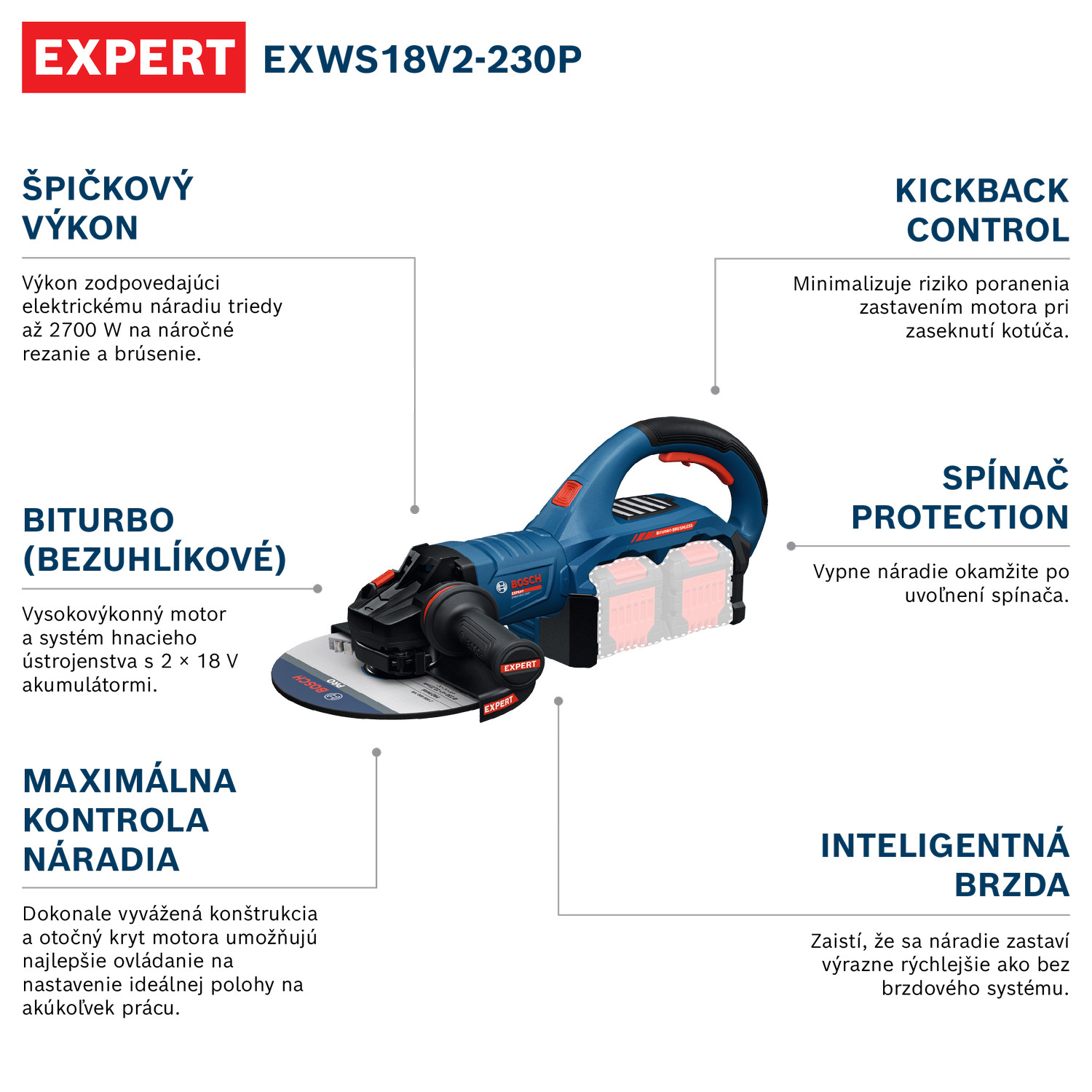A nagy teljesítményű EXPERT EXWS18V2-230P sarokcsiszoló kefementes motorral és 2× 18 V akkumulátorral rendelkezik, amely teljesítményt biztosít, amely megfelel a 2700 W-os elektromos szerszámok osztályának a gyors és hatékony munkavégzéshez. A BITURBO Brushless technológia és a 2× 18 V akkumulátorok, a nagy teljesítményű motor és a hajtómű különösen az EXPERT akkumulátorok extrém teljesítményének kihasználására lettek tervezve. A motor forgatható burkolata lehetővé teszi az ideális pozíció beállítását bármilyen vágási vagy csiszolási tevékenységhez. A tökéletesen kiegyensúlyozott konstrukció és az ideális súlypont emellett kiváló kezelhetőséget biztosít a szerszám számára minden helyzetben. Az EXPERT EXWS18V2-230P fejlett felhasználóvédelmi funkciókkal rendelkezik: A KickBack Control funkció minimalizálja a sérülés kockázatát a tárcsa megakadásakor. A PROtection kapcsoló azonnal leállítja a szerszámot, ha elengedjük, és az intelligens fékrendszer biztosítja, hogy a szerszám lényegesen gyorsabban megálljon, mint fékrendszer nélkül.