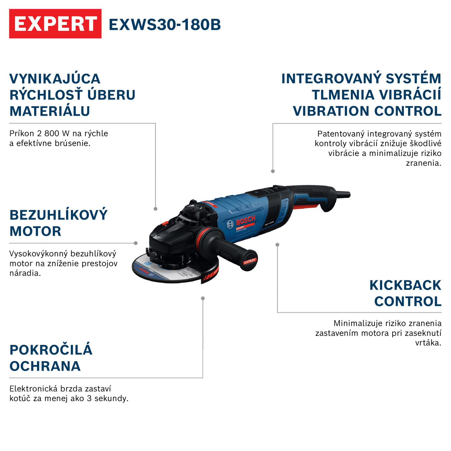 AZ EXPERT EXWS30-180B magas anyageltávolítási sebességet biztosít a 2800 W-os szénkefementes motor révén, amely egyben csökkenti a karbantartási igény gyakoriságát a kevesebb kopóalkatrész és a szénkefák elkerülése miatt. Ez az eszköz sokoldalú biztonságot és praktikusságot nyújt elektronikus fékkel, amely kevesebb mint 3 másodperc alatt megállítja a tárcsát, KickBack Control funkcióval, újraindulás elleni védelemmel és fokozatos indítással. A beépített Vibration Control rendszernek köszönhetően, amely minimalizálja a rezgéseket, a munka kevésbé fárasztó lesz.