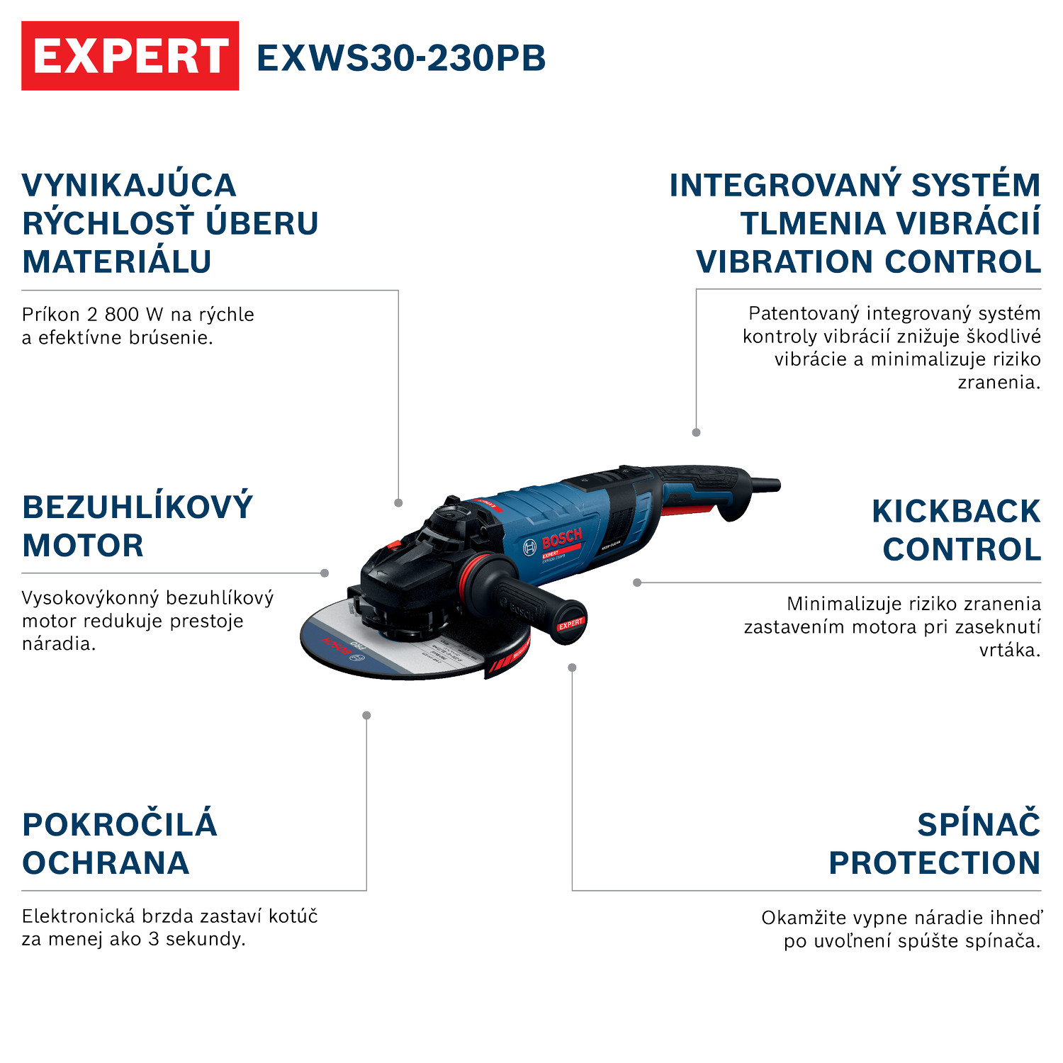 AZ EXPERT EXWS30-230B 2800 W-os szénkefementes motorjának köszönhetően magas anyageltávolítási sebességet biztosít, amely egyben csökkenti a karbantartási igény gyakoriságát a kevesebb kopóalkatrész és a szénkefák elkerülése révén. Ez az eszköz sokoldalú biztonságot és praktikusságot nyújt elektronikus fékkel, amely kevesebb mint 3 másodperc alatt megállítja a tárcsát, KickBack Control funkcióval, újraindulás elleni védelemmel és fokozatos indítással. A beépített Vibration Control rendszernek köszönhetően, amely minimalizálja a rezgéseket, a munka kevésbé fárasztó lesz.