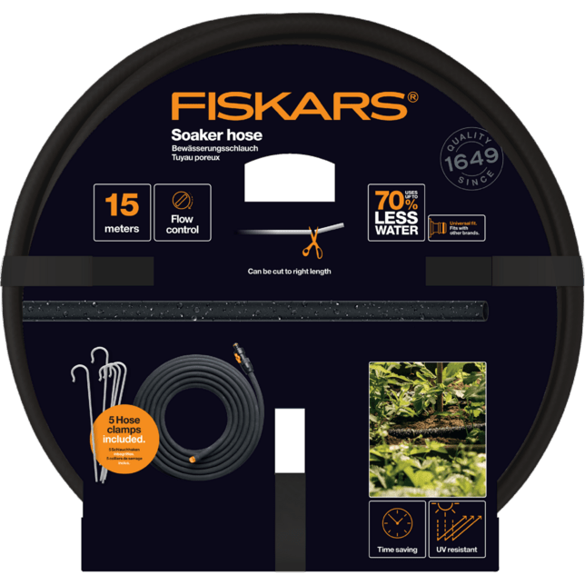 Az öntözés egyenletes a tömlő teljes hosszában, amely szükség esetén hagyományos ollóval rövidíthető. A csomag tartalmaz egy szabályozószelepet a víz áramlásának és nyomásának pontos beállításához. A csomag 5 fém rögzítőt tartalmaz az egyszerű telepítéshez. A tömlő UV-védelemmel is rendelkezik, ami meghosszabbítja élettartamát.