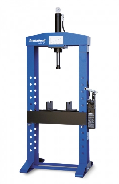 Hidraulikus oszlopprés kézi pumpával. Minden javító- és szerelési munkához, pl. tengelyek, gerendák, tengelyek kiegyenlítése és hasonlók; csapágyak, csavarok és hüvelyek kiütése és behelyezése; terhelési tesztek és hegesztési vizsgálatok, valamint sok más.